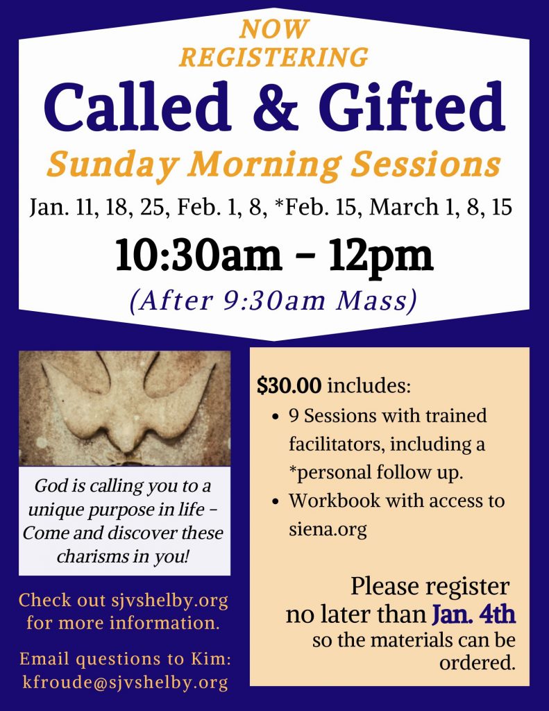 Click here to Sign up for information about upcoming Called and Gifted sessions. Questions? Email Kim Froude at: kfroude@sjvshelby.org Share via: